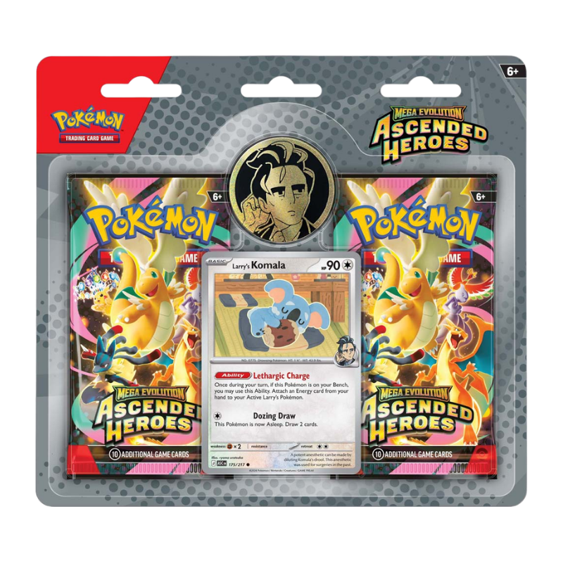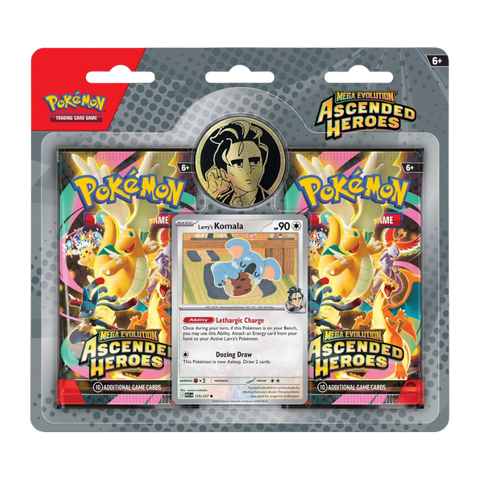The Celadon City Gym, led by Gym Leader Erika, is filled with beautiful greenery and Grass-type Pokémon galore. Visitors to Medali in the Paldea region have the chance to battle Gym Leader Larry and his Normal type Pokémon. In this collection, you’ll find a promo card featuring either Erika’s Tangela or Larry’s Komala, a metallic coin featuring your chosen Gym Leader, and two booster packs from the special Mega Evolution—Ascended Heroes expansion.
