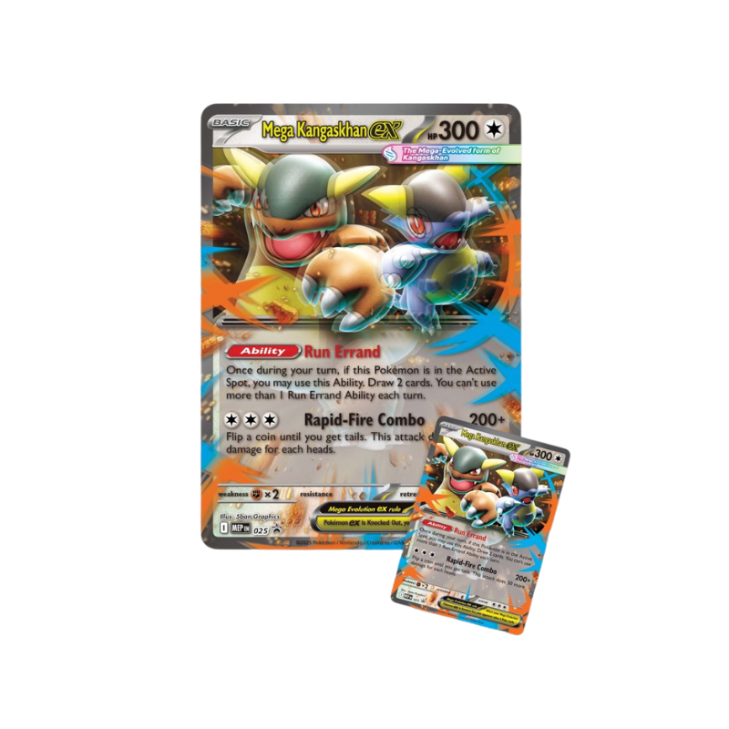 Mega Evolution makes Kangaskhan’s child a force to be reckoned with—and both of them combine their powers as Mega Kangaskhan ex! Draw extra cards with Run Errand, then use Rapid-Fire Combo and flip coins to seek bigger damage. Team up with Mega Kangaskhan ex as a playable foil promo card and an oversize lenticular version for display, then open four booster packs to find even more cool cards!